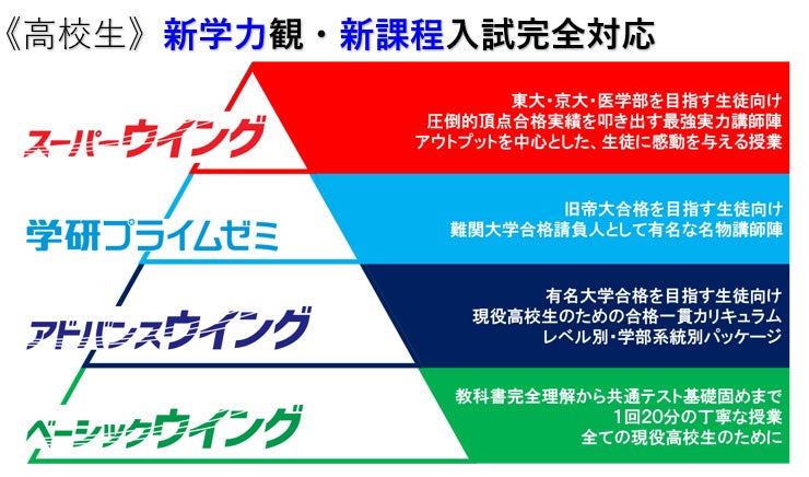 従来のウイングネットコンテンツ「ベーシックウイング」(教科書対応定期テスト対策・共通テスト対策・基礎力定着)、「アドバンスウイング」(国公立・有名私大対策)、「学研プライムゼミ」(難関国公立・私大対策)」の3つのコンテンツに加え、新たに東大・京大・医学部など最難関大学を目指す生徒を対象に、学びを広げる「スーパーウイング」を新たに作成。