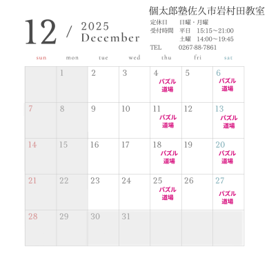 「 小学生 」 一覧 ほぼ毎日更新ブログ 【2025】12月の営業カレンダー 2025/11/29 ほぼ毎日更新ブログ 定期テスト対策だけではもったいない! 11月の復習ポイント― テスト範囲外こそ、伸びるチャ... 2025/11/25 ほぼ毎日更新ブログ 【中学受験を考え始めた4・5年生へ】冬休みから始める、“伸びる子”の学習習慣 2025/11/21 ほぼ毎日更新ブログ 冬休みだからこそ、ゆっくり始められる学びがあります― 不登校・登校に不安のあるお子さまへ ... 2025/11/18 ほぼ毎日更新ブログ この冬、「できた!」を増やそう!個太郎塾の冬期講習でぐんぐん伸びる小学生たち 2025/11/14 ほぼ毎日更新ブログ 小学生にとっての11月は“総まとめ準備”のスタート!~2学期の学びを冬に向けてしっかり定着... 2025/11/11 12345 > >> LINEお友だちに登録して、お得なクーポンやキャンペーン情報をGETしよう 個太郎塾佐久市岩村田教室のLINE公式アカウントにお友達登録すると… 特典1 お子さまの学年に合った内容のお役立ちメルマガを読むことができる! 特典2 お得なキャンペーンの情報を受け取れる! 特典3 期間限定クーポンを確実にGET! 【お友達登録の方法】 ①下の「LINEマーク」をタップ、またはQRコ4ードを読み取ってください。 ②「追加」を押してお友達登録する。 個太郎塾佐久市岩村田教室の公式LINE