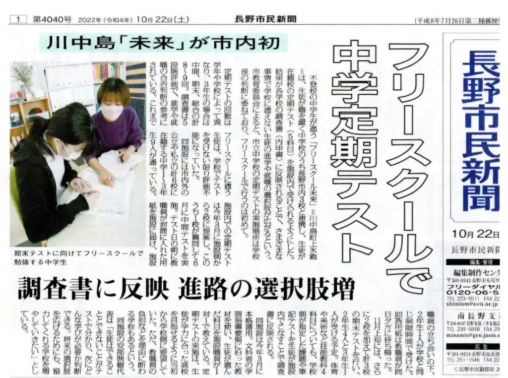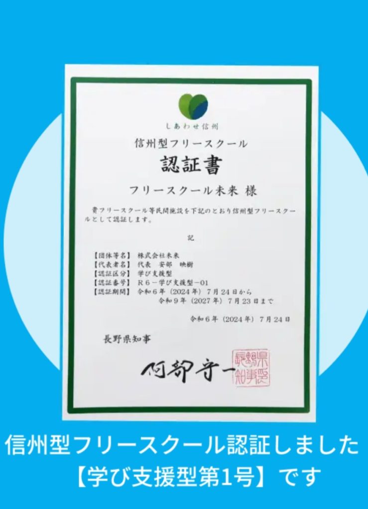 本部校は「信州型フリースクール認証・学び支援型」の実績あり。